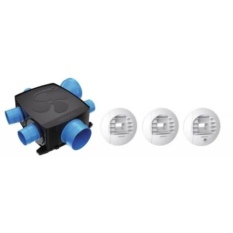 Livré avec 3 bouches d’extraction hygroréglables (1 cuisine Ø 125 mm / 1 WC (détection de présence) Ø 80 mm / 1 salle de bain Ø 80 mm).